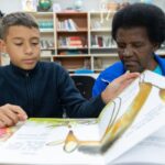 “Quando eu vinha para a aula, eu trazia ele junto. Ainda trago. Aí vamos para a biblioteca, eu pego um livrinho e a gente começa a ler. É muito bom.” Ela mesma escolhe os livros, geralmente pela capa. Pedro lê para ela com paciência e dedicação. “É. Tem que ser, né?”, comenta ela, entre sorrisos.