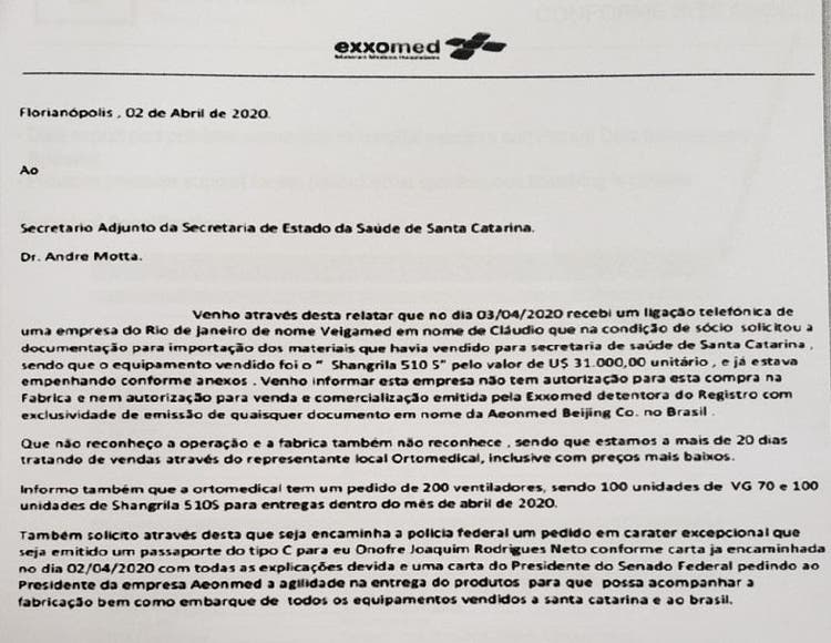 Estado -A empresa contratada pelo Governo do Estado de Santa Catarina na compra de respiradores não tinha autorização para importar equipamentos. Um e-mail enviado pela empresa paulista Exxomed à Secretaria de Estado da Saúde indica que o governo de Santa Catarina sabia, desde o dia 2 de abril, que os respiradores comprados pela Veigamed tinham representação exclusiva por outra empresa no Brasil, e não poderiam ter sido importados. Assinado pelo representante da Exxomed, Onofre Joaquim Rodrigues Neto, o e-mail foi endereçado ao então secretário adjunto, André Motta – hoje secretário de Estado da Saúde.