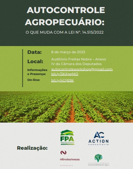 Para trazer o detalhamento regulatório, técnico e jurídico, a Frente Parlamentar da Agropecuária (FPA), Action Consultoria, Instituto Brasileiro de Regulação e Sustentabilidade Agro e Oliveira Souza Advogados promovem o seminário “Autocontrole Agropecuário: O que muda com a Lei nº 14.515/2022”, dia 8 de março, das 9h às 17h30. O evento acontece no Auditório Freitas Nobre – Anexo IV da Câmara dos Deputados.