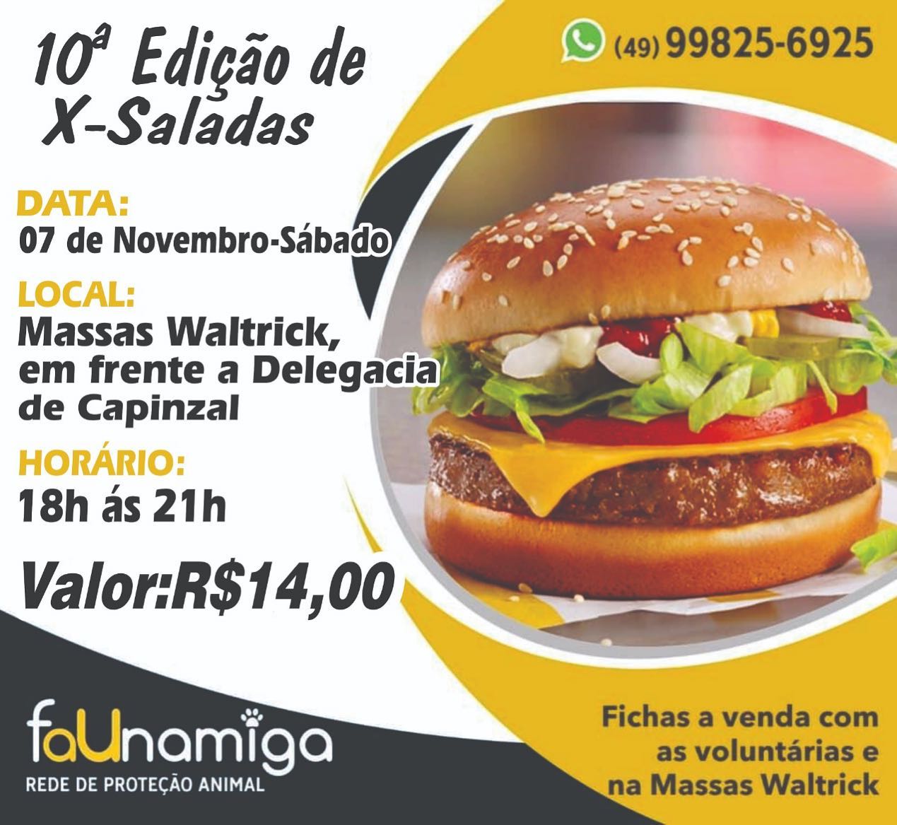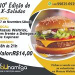 Capinzal – A ONG FAUNAMIGA promoverá a décima edição de X-Saladas. A programação será no dia 7 de novembro, das 8h às 21h. Compra antecipada de fichas no valor de R$ 14,00 pode ser feita no Animalle Mundo Pet, nas Massas Waltrik (em frente à delegacia de Capinzal) e com as voluntárias. A ação tem por objetivo ajudar a causa animal a seguir com seu trabalho. As fichas são limitadas. Informações pelo fone (49) 99825-6925.