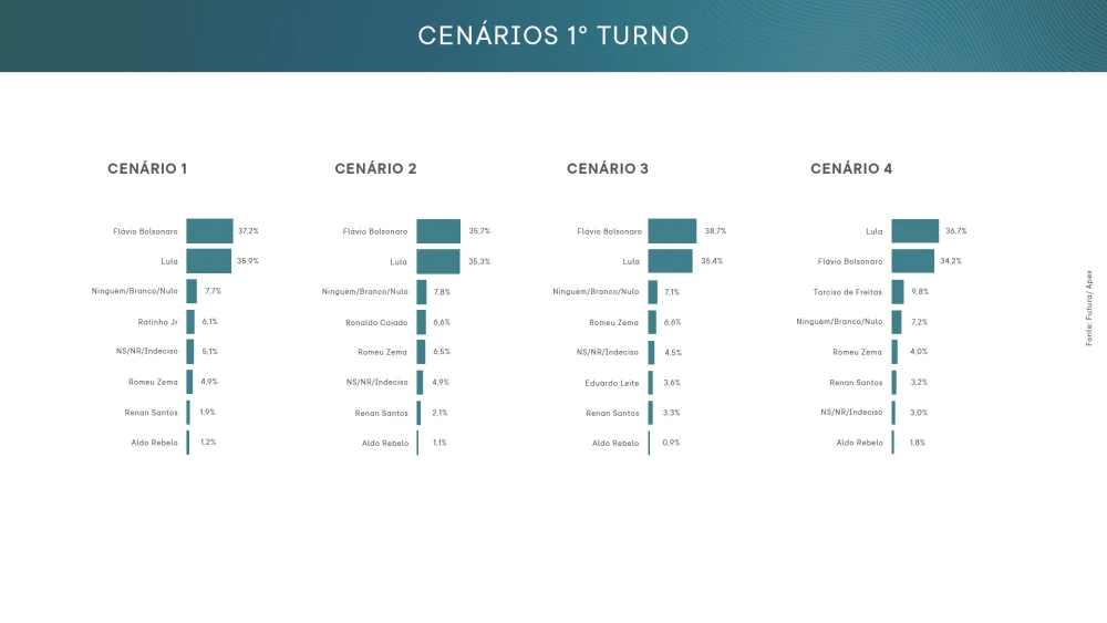 O senador Flávio Bolsonaro lidera em três dos quatro cenários estimulados da pesquisa Futura/Apex, divulgada nesta terça-feira (10). O filho do ex-presidente Jair Bolsonaro só não fica à frente do presidente Luiz Inácio Lula da Silva (PT) quando Tarcísio de Freitas (Republicanos) é colocado entre os concorrentes, segundo o levantamento.