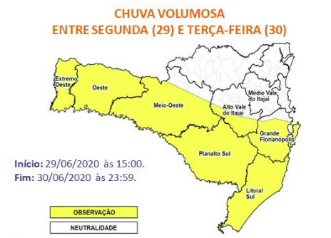 Previsão: A partir da tarde desta segunda-feira (29), a atuação de uma área de baixa pressão deixa o tempo instável e com chuva em Santa Catarina, iniciando no Oeste e se espalhando para as demais áreas no decorrer do dia. Na terça-feira (30), a passagem de uma frente fria e a formação de um ciclone extratropical também devem provocar precipitação em todas as áreas. Entre estes dois dias são esperados volumes elevados no estado, que podem ultrapassar os 100 mm nas áreas do Oeste ao litoral (em amarelo no mapa). Devido a esta condição, não são descartadas a possibilidade de risco de ocorrências de deslizamentos, alagamentos, enxurradas e, pontualmente, de inundações.