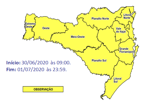 Previsão: Nesta terça-feira (30), as condições de tempo são favoráveis, a partir do final da manhã, para a ocorrência de rajadas de vento constantes, com direção predominante de quadrante noroeste/oeste, podendo chegar aos 100 km/h. Ao longo de toda a quarta-feira (01), estas mesmas rajadas de vento passam a ser mais persistentes e intensas, de quadrante oeste, com tendência de ser acima dos 100 km/h, na faixa centro-leste do estado. Devido a esta condição, não se descarta a possibilidade para ocorrências associadas a vendavais.