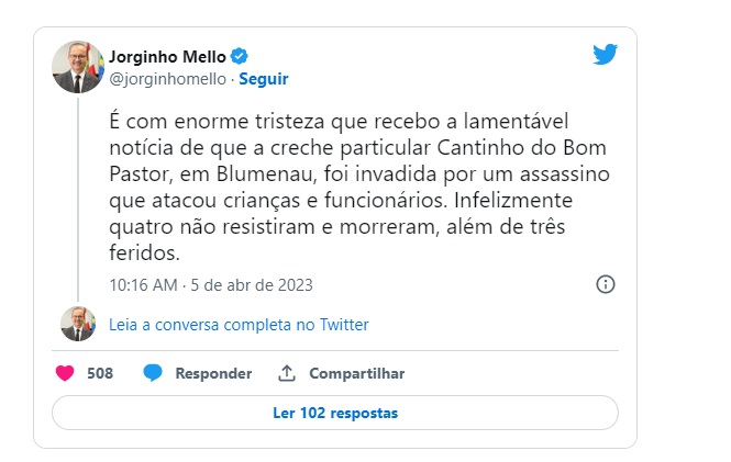 O Governador de Santa Catarina, Jorginho Mello, se manifestou pelas redes sociais, na manhã desta quarta-feira (05), após um homem de 25 anos, cometer um ataque em uma Creche de Blumenau, em Santa Catarina. Em nota divulgada à imprensa, através da assessoria de comunicação, Mello lamenta o episódio e afirma que todos os esforços estão sendo feitos para auxiliar as famílias. Leia: