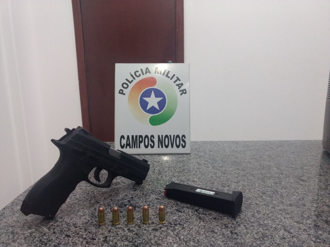 No local foi abordado um Fiat Toro conduzido por um homem de 45 anos. Após busca pessoal e veicular foi encontrada, em um fundo falso, uma pistola calibre 380 com cinco munições intactas.