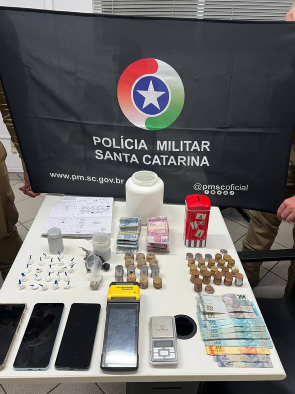 Diante da fundada suspeita e da situação de flagrante delito, as guarnições realizaram a entrada na residência. No local, foram apreendidos 39,10 g de cocaína fracionada em 22 porções, 0,68 g de haxixe, além de R$ 1.554,00 em espécie, R$ 491,00 e R$ 23,05 em moedas, uma balança de precisão, aparelhos celulares e anotações relacionadas ao tráfico.