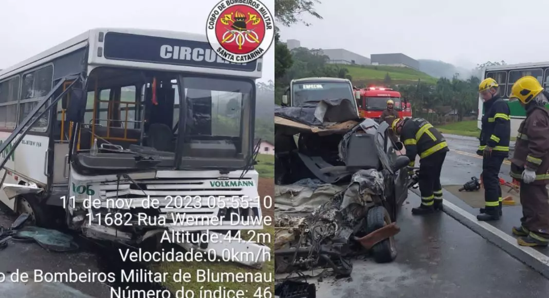 O acidente aconteceu por volta das 5h35, no limite entre as cidades de Blumenau e Pomerode. De acordo com informações do Corpo de Bombeiros, o carro e o ônibus colidiram frontalmente. O motorista do carro, que era maior de idade, ficou preso às ferragens e não resistiu aos ferimentos.