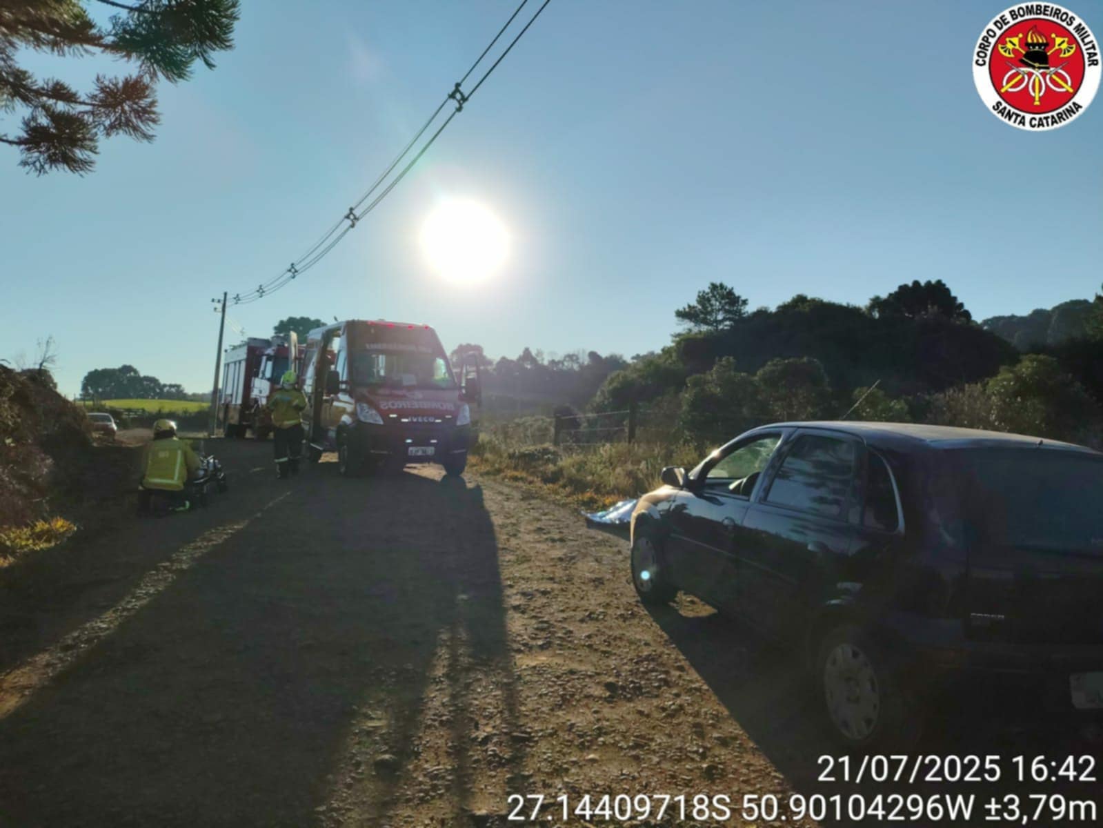 Após procedimentos de APH, a paciente foi protocolada e imobilizada em maca rígida sendo encaminhada estável para o Hospital Fraiburgo. A cena com a vítima em óbito e o veículo, ficaram aos cuidados da Polícia Militar.