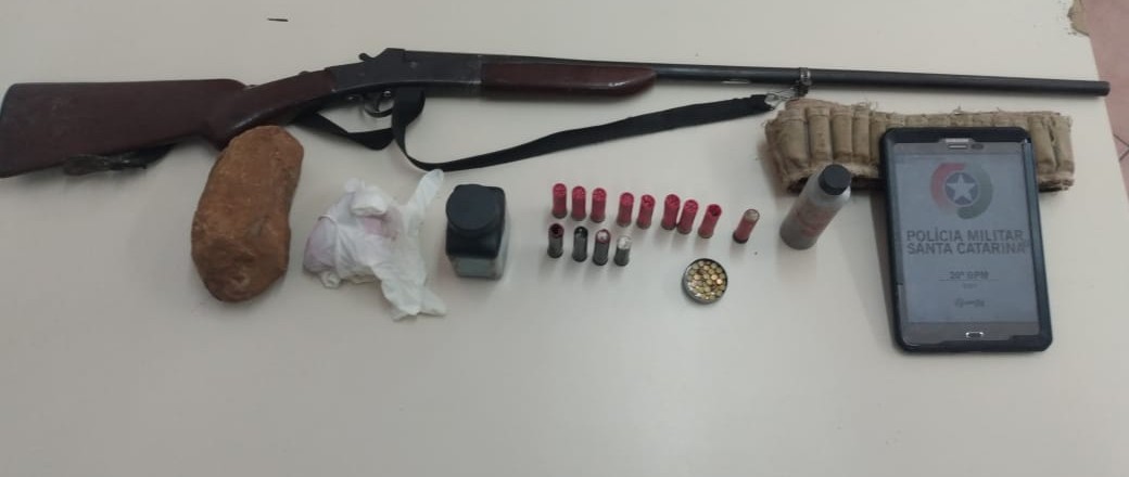A PM também tinha informações de que o suspeito possuía uma arma de fogo, uma espingarda calibre 32 sem registro. Indagado sobre os fatos o mesmo confirmou possuir a espingarda.