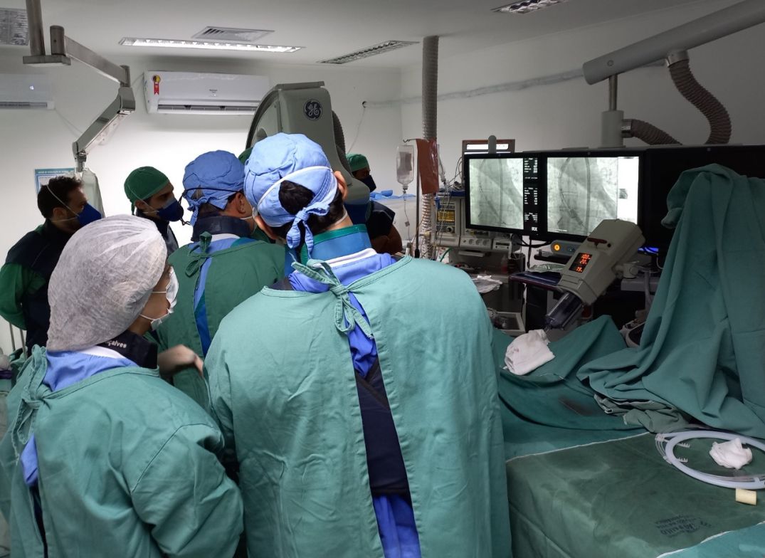 Vários profissionais do HRSP estiveram envolvidos na realização do procedimento, dentre eles cirurgiões cardiovasculares, hemodinamicistas, cardiologistas clínicos, anestesista, enfermeiros e técnicos em enfermagem. A equipe também contou com o apoio do Cardiologista Intervencionista do Instituto de Cardiologia de Porto Alegre, Dr. Rogério Sarmento Leite, que atuou como médico proctor – profissional com longa experiência que atuou orientando a equipe. O profissional esteve acompanhado por uma profissional técnica para a preparação da prótese.