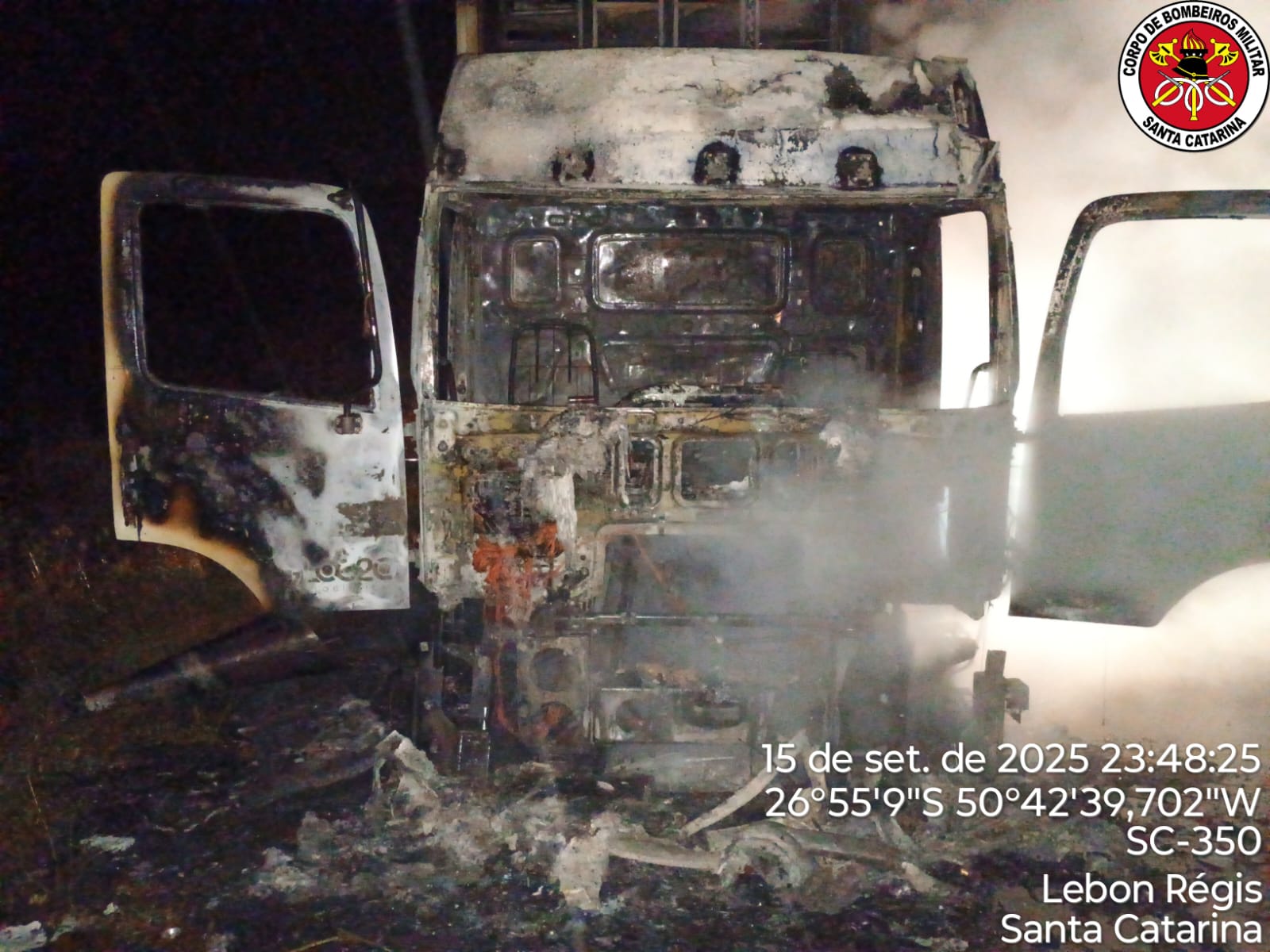 Lebon Régis – Por volta das 23h20 desta segunda-feira (15) o Corpo de Bombeiros foi acionado para atender a uma ocorrência de incêndio em veículo às margens da SC-350, no sentido Caçador. Chegando ao local a guarnição confirmou se tratar de um incêndio em desenvolvimento completo em um caminhão VW/25.420. O veículo estava carregado com pallets de cerveja.