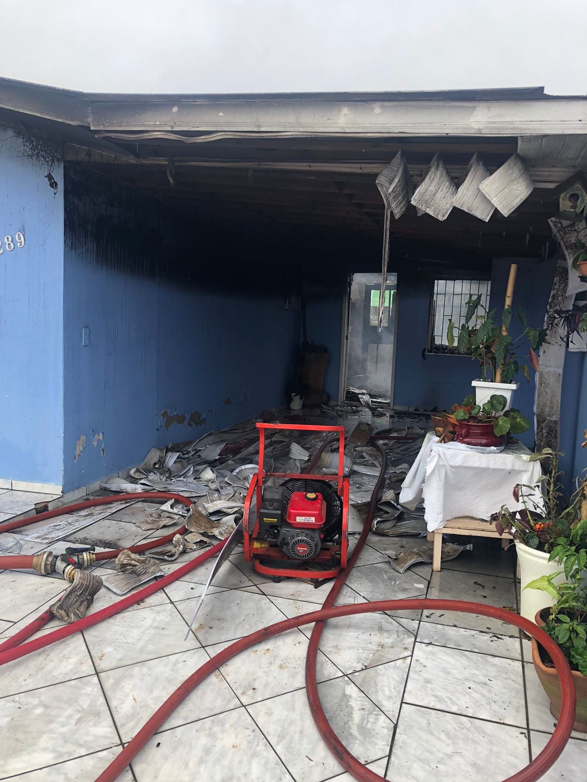 Foram usados aproximadamente 8 mil litros de água. O incêndio destruiu parcialmente a residência juntamente com móveis e utensílio domésticos, de propriedade de um homem de 53 anos, e que era habitada por seis pessoas.
