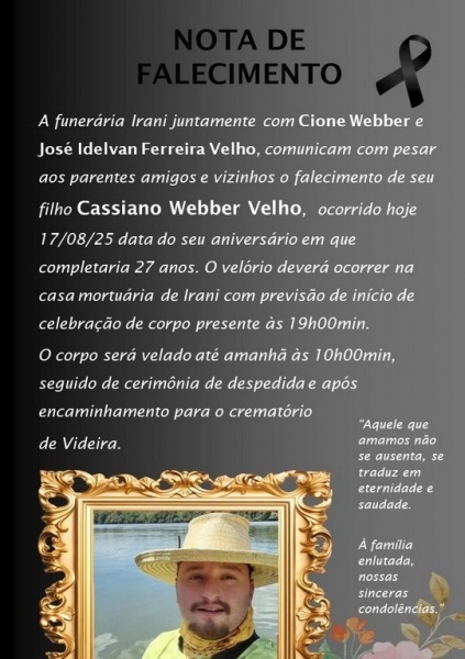A vítima foi identificada como Cassiano Webber Velho, morador de Irani, que completaria 27 anos neste domingo. A notícia da morte causou grande comoção entre familiares e amigos.
