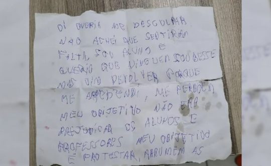 Um trecho da carta divulgado traz as seguintes palavras: “Oi, gostaria de pedir desculpas. Não imaginei que faria diferença. Sou um dos alunos e quis manter isso em segredo. Porém, decidi devolver porque estou arrependido, peço perdão. Meu intuito não era prejudicar colegas e professores; era um tipo de protesto.”