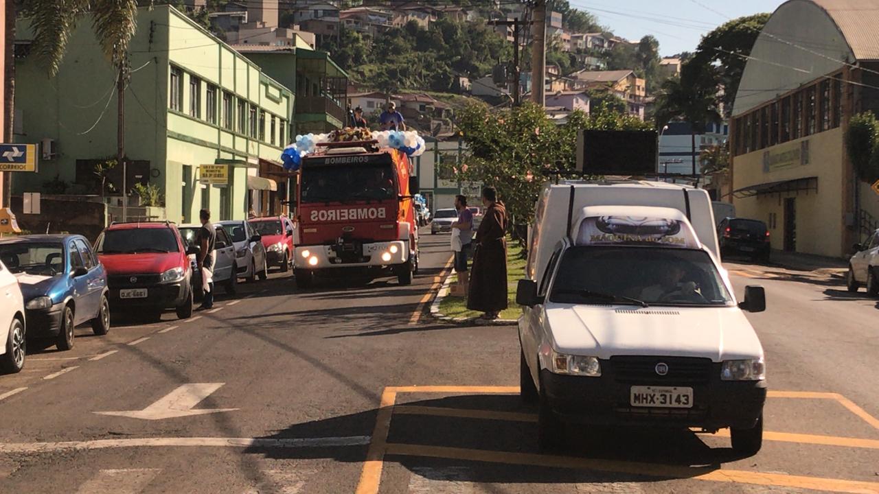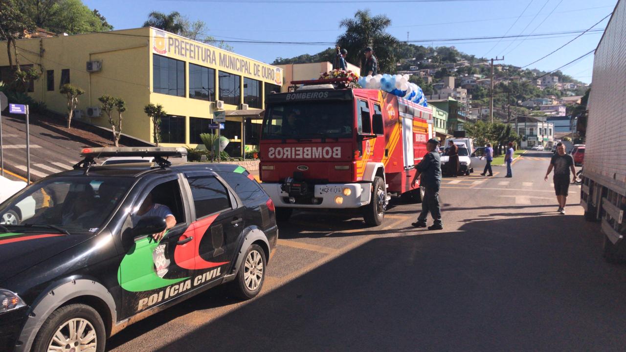 Ouro – A comunidade de Linha Sul, no interior de Ouro, realizou neste sábado (12) a procissão em honra a Nossa Senhora Aparecida. A programação iniciou pela manhã com a procissão motorizada com saída defronte à Prefeitura. Em seguida, a imagem da padroeira foi levada pelo caminhão do Corpo de Bombeiros até a comunidade de Linha Sul.