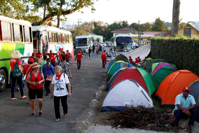 Vestindo um blazer preto com camisa preta, o petista deixou a sede da corporação, onde estava preso há 580 dias, em meio a centenas de apoiadores. Integrantes da Vigília Lula Livre, acampamento montado nas proximidades da PF desde que ele foi encarcerado, hastearam bandeiras e entoaram gritos de apoio ao petista. A namorada de Lula, Rosângela da Silva, conhecida como Janja, também estava na porta da Polícia Federal. Lula deu um beijo na namorada e um abraço na filha. Em seguida, estendeu a placa: “Lula é inocente.”