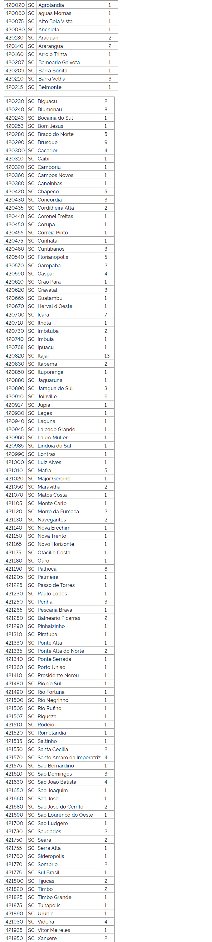 Cada uma das cidades vai contar com no mínimo um médico do programa, mas 15 terão no mínimo quatro médicos do programa. Itajaí é o município com mais postos e lidera a lista com 13 vagas. Depois estão Brusque (9), Blumenau e Palhoça (8), Içara (7) e Braço do Norte, Chapecó, Florianópolis e Mafra (5).