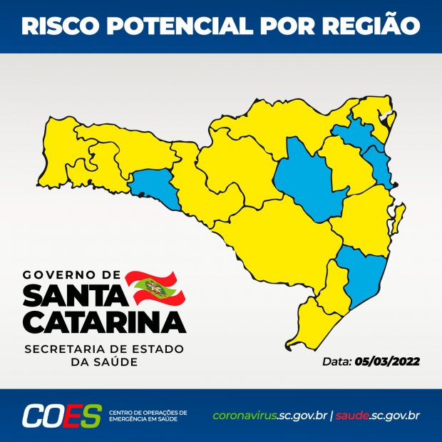 A matriz de risco potencial regionalizado, divulgada neste sábado, 05, aponta cinco regiões classificadas no nível moderado (cor azul): Alto Uruguai Catarinense, Alto Vale do Itajaí, Foz do Rio Itajaí, Laguna e Vale do Itapocu, e 12 regiões foram classificadas como nível alto (cor amarela): Alto Vale do Rio do Peixe, Carbonífera, Extremo Oeste, Extremo Sul Catarinense, Grande Florianópolis, Médio Vale do Itajaí, Meio Oeste, Nordeste, Oeste, Planalto Norte, Serra Catarinense e Xanxerê.
