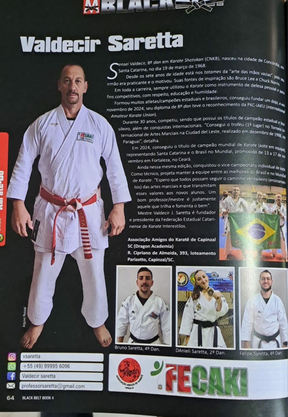 Valdecir Saretta é fundador e presidente da Federação Estadual Catarinense de Karate Interestilos. A reportagem traz ainda imagens do mestre e de seus alunos e familiares Bruno Saretta (4º dan), Danieli Saretta (2º dan) e Felipe Saretta (4º dan), além dos contatos para redes sociais e WhatsApp, bem como o endereço da Associação Amigos do Karatê de Capinzal (Dragon Academia).