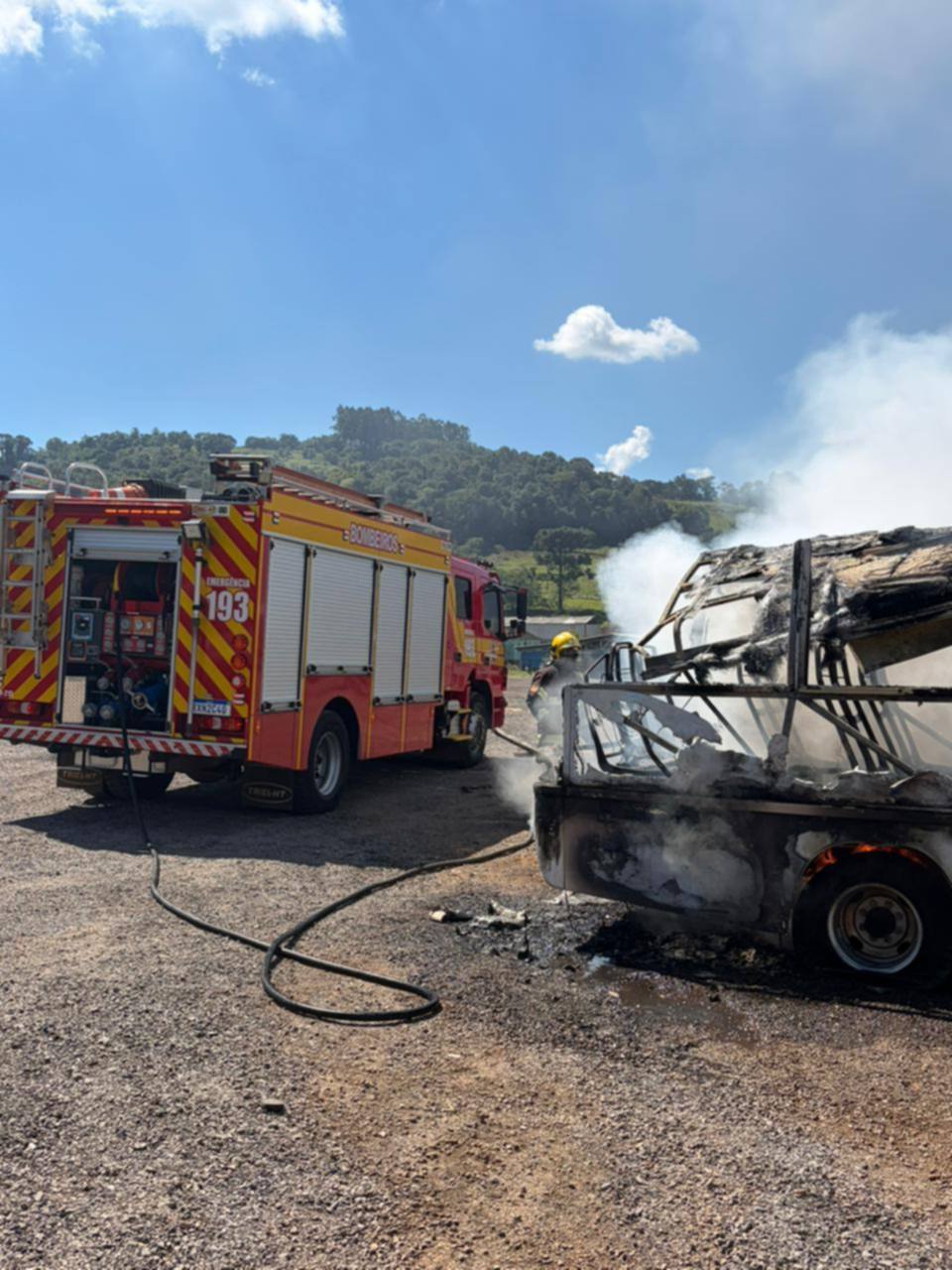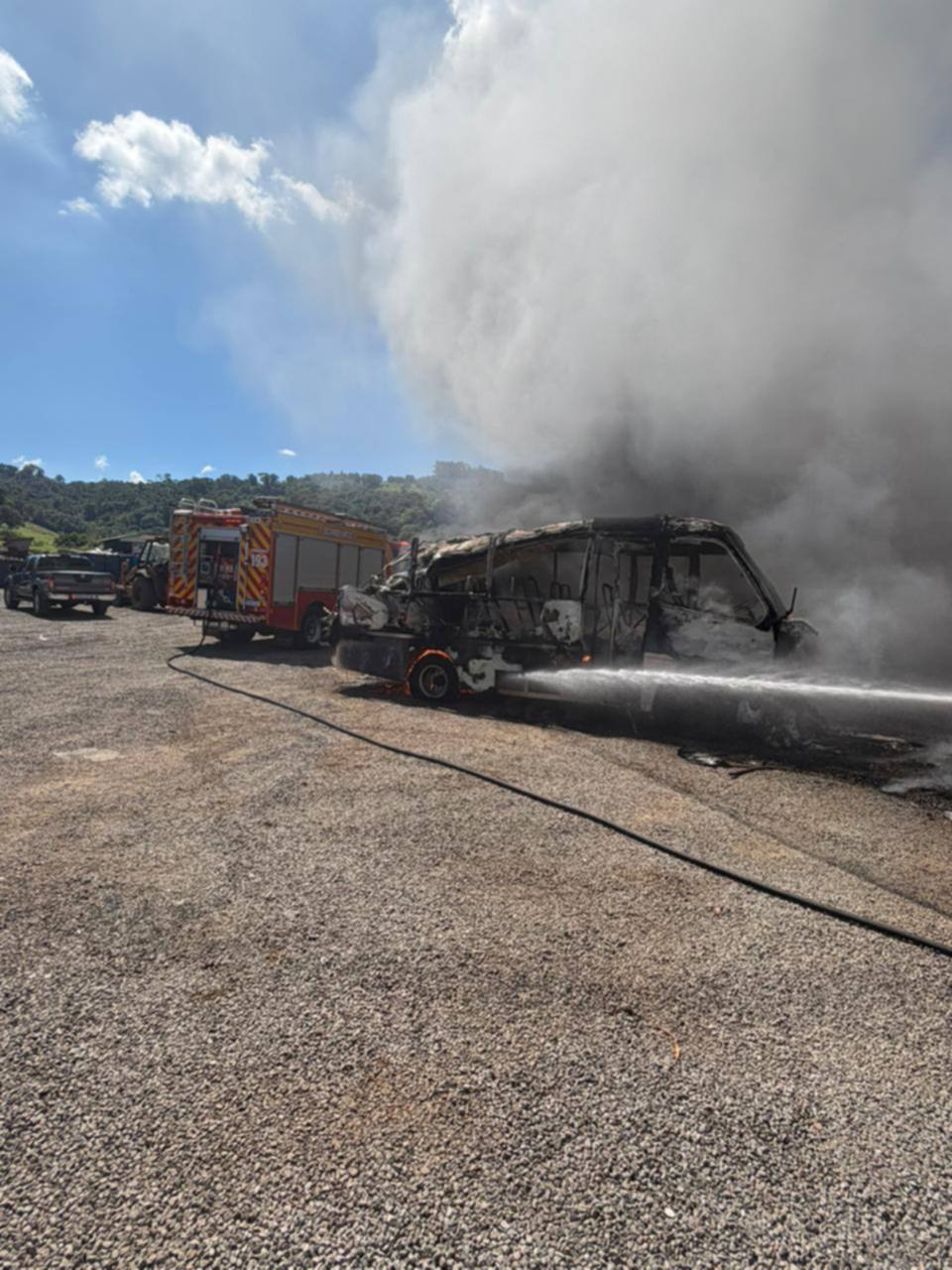No local, um micro-ônibus VW/Volare já estava praticamente destruído pelas chamas, em fase final do incêndio. Os bombeiros realizaram o controle dos focos restantes e o resfriamento da área para evitar a reignição.