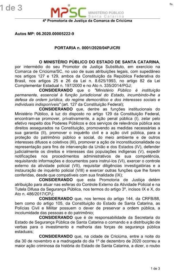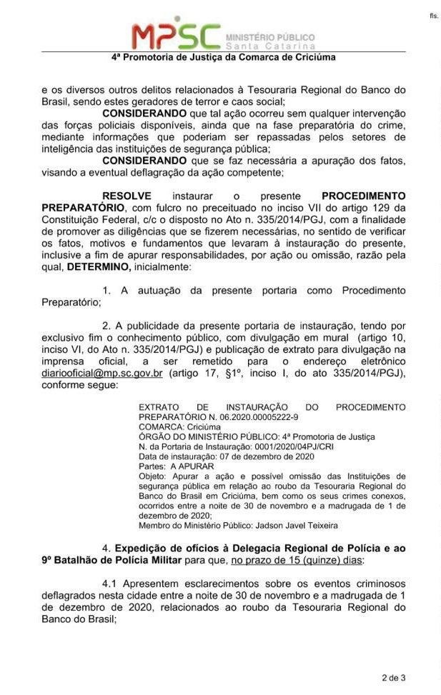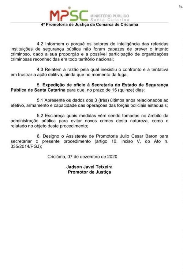O promotor de justiça Jadson Teixeira protocolou ofícios nos órgãos de segurança da cidade pedindo formalmente dados, informações sobre o ocorrido, e principalmente como é que a movimentação da quadrilha não foi identificada.