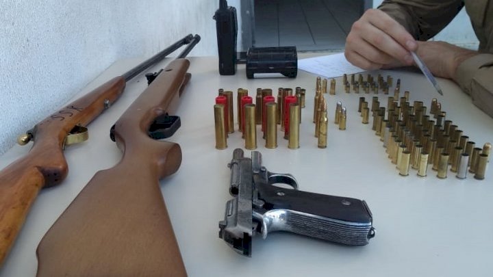 Em revista nos cômodos da residência, foram localizadas no guarda roupas diversas munições de calibres variados (762, 380, 32, 25, 28 e 8mm). Também foram apreendidas duas espingardas, uma de calibre 32, e outra de pressão, que possivelmente foi utilizada na morte do animal.