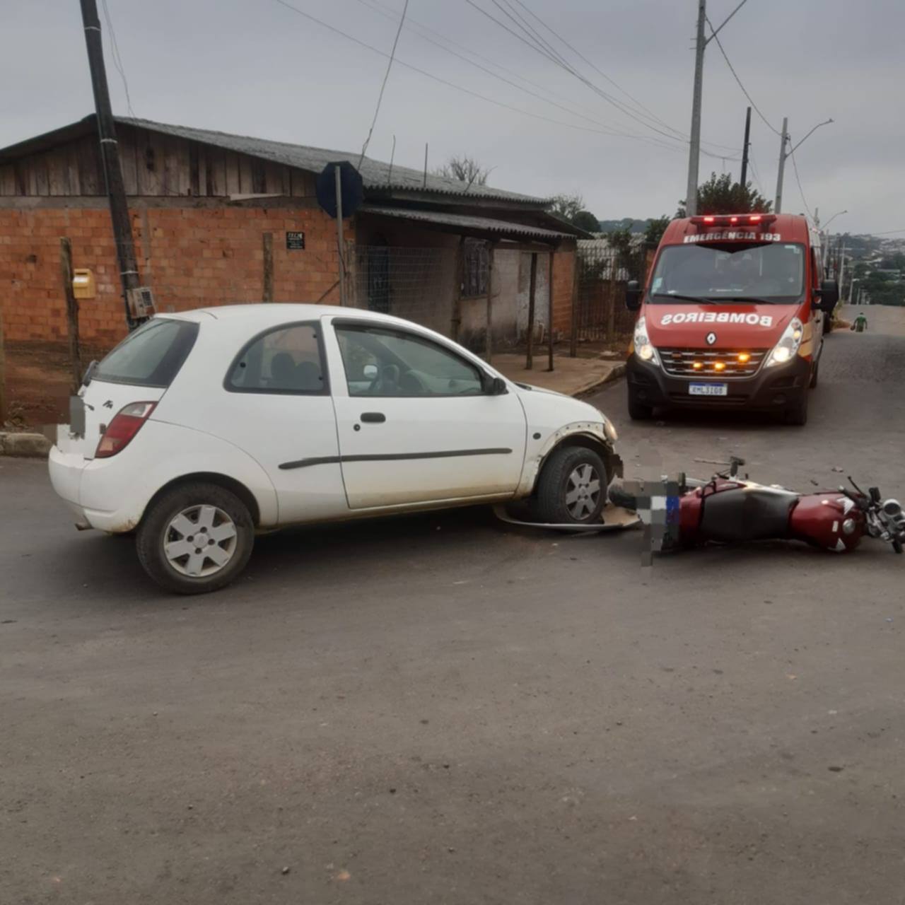 A ocorrência envolveu uma colisão frontal entre um Ford Ka branco e uma motocicleta Honda Twister 250 vermelha.