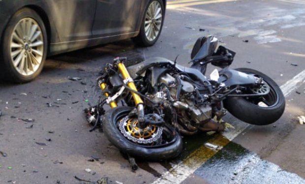 Com o impacto um dos pneus do semi reboque foi arrancado. A moto ficou praticamente destruída e o condutor foi projetado para fora da pista.