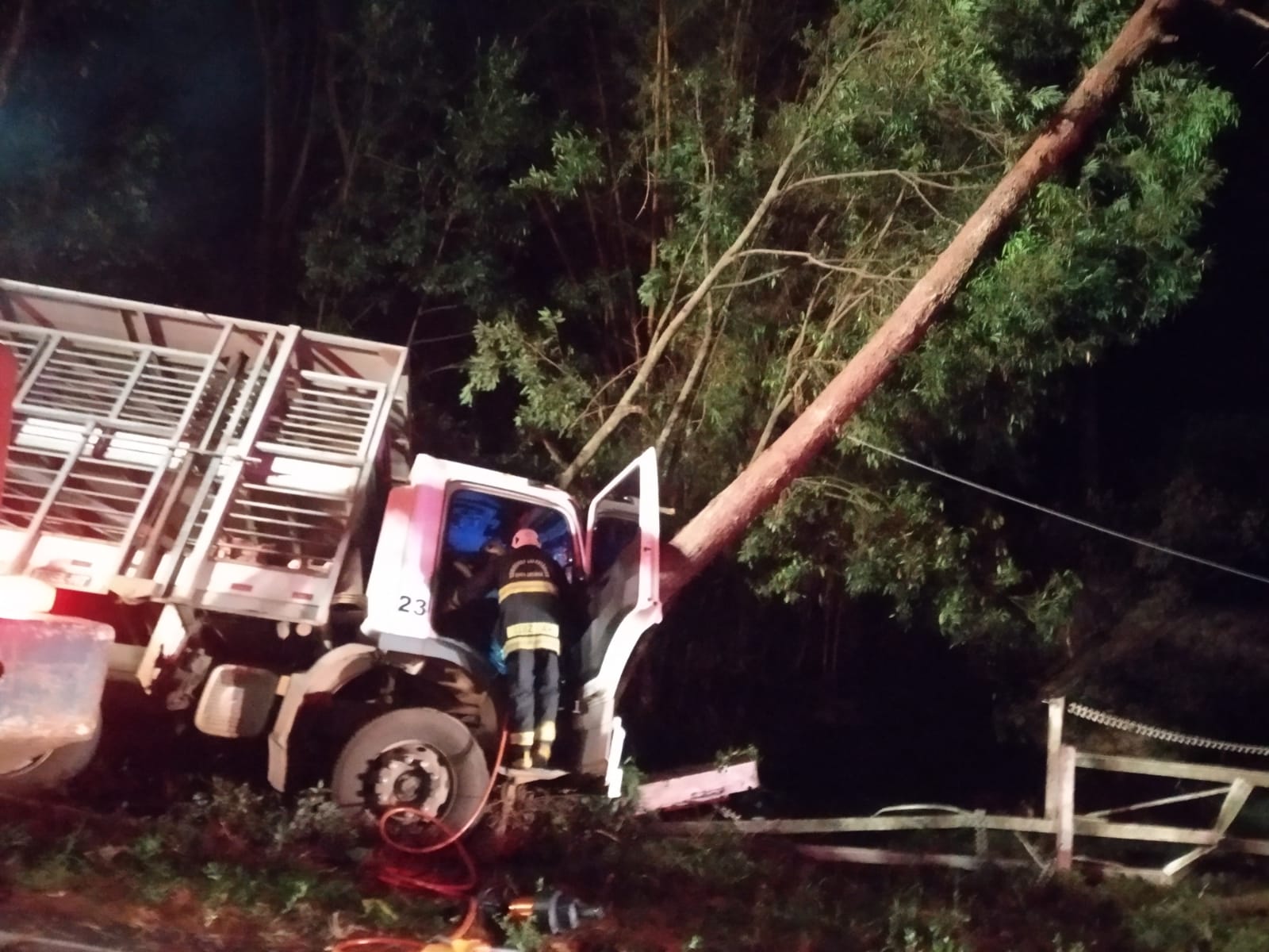 O motorista de um caminhão usado para o transporte de suínos ficou preso nas ferragens e precisou ser resgatado pelos bombeiros. Os socorristas receberam o chamado por volta das 4h30 para fazer os atendimentos no local e removê-lo. O condutor ficou preso pelo abdômen e pernas. Reclamava de dores nessas duas regiões. Ele foi retirado da cabine pela porta do carona.