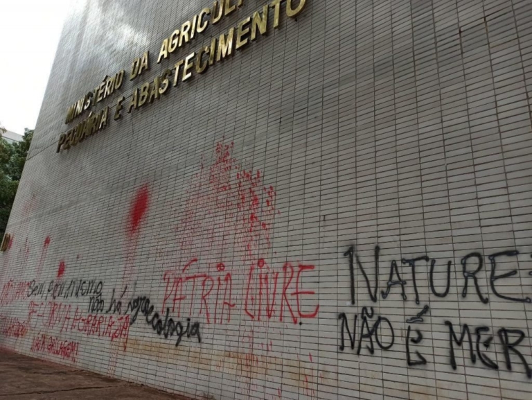 Mulheres integrantes do Movimento Sem Terra (MST) invadiram a sede do Ministério da Agricultura, na manhã desta segunda-feira (9), em Brasília. Em protesto contra a liberação de novos registros de agrotóxicos, elas jogaram tinta vermelha no chão.