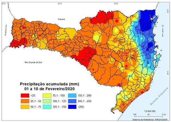 Nos meses de verão é comum o registro de totais mensais acima de 400 mm, em pelo menos um dos municípios do Litoral Catarinense, quando a precipitação é fortemente e influenciada pelo fluxo de umidade proveniente do mar, combinado com o efeito da orografia local. Segundo a Epagri/Ciram, o acumulado de 716,4 mm é o maior desde 2013, quando a estação de medição foi instalada. Como o mês de fevereiro ainda não terminou, os acumulados de chuva serão ainda maiores do que o apresentado.