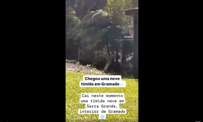 O alerta emitido pelo Instituto Nacional de Meteorologia (INMET) sobre queda de neve se confirmou no Rio Grande do Sul. Durante a tarde desta terça-feira (28), moradores registraram o fenômeno na localidade de Serra Grande, no interior de Gramado.