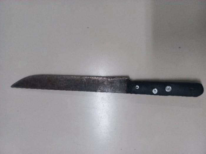 No local, as guarnições abordaram um homem de 21 anos que, segundo informações, teria ameaçado sua companheira utilizando um facão com lâmina de aproximadamente 25 centímetros.