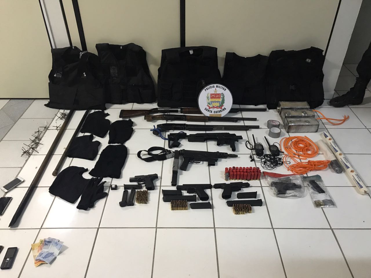 Ao todo, os policiais apreenderam cinco tocas balaclava, cinco coletes balísticos, três espingardas calibre 12, uma submetralhadora 9mm, quatro pistolas 9mm, 30 munições calibre 12, 196 munições de pistola, duas emulsões encartuchadas, três artefatos explosivo improvisados, um cordel detonante, 10 espoletas, estopim, dois rádios comunicadores, R$ 103, duas barras de aço tipo alavanca, seis aparelhos de telefone celular e 17 miguelitos.