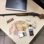 Nesta manhã foram apreendidos aproximadamente 30g de cocaína, 20 gramas de crack, 30 gramas de maconha embalados para venda, uma espingarda, munições, balanças de precisão, dinheiro, anotações relacionadas ao tráfico e uma motocicleta adulterada.