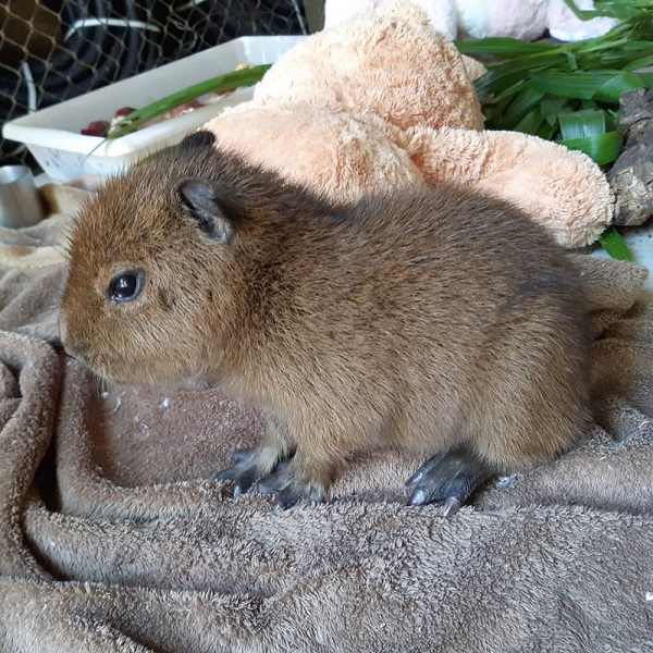 A capivara ficou órfã após a  família ser atacada por cães. Os pais fugiram, um filhote foi morto e a pequena ficou para trás. Ela foi resgatada pela Polícia Militar Ambiental (PMA), que a levou até o parque para receber os cuidados necessários.
