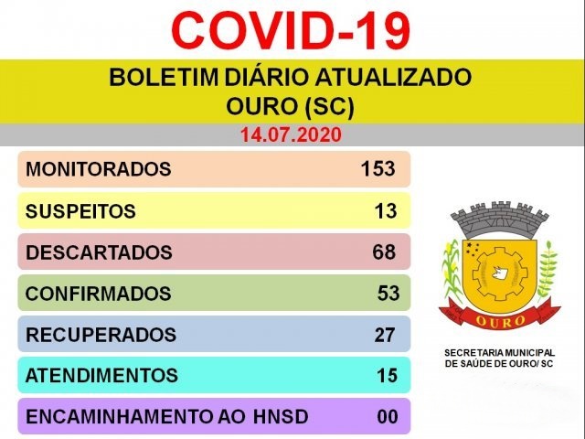 Ouro – Quatro novos casos de Coronavírus foram registrados nas últimas 24 horas em Ouro. A informação consta no boletim divulgado nesta terça-feira (14) pela secretaria municipal de Saúde. No total são 53 casos positivados para Covid-19. Casos suspeitos são 13, recuperados 27, 153 monitorados e 68 descartados. Até o momento foram realizados 15 atendimentos no Centro de Triagem.