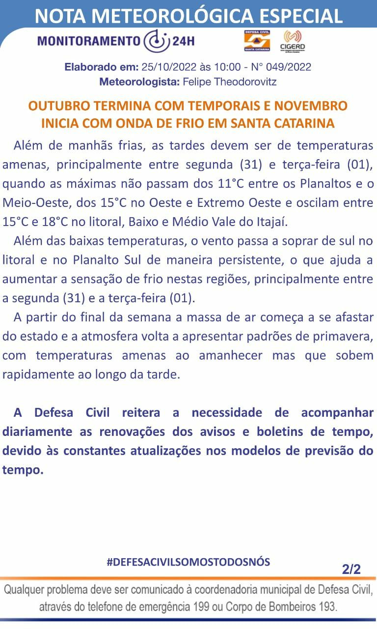 Outubro termina com temporais e novembro inicia com onda de frio em Santa Catarina Região 25 de outubro de 2022Redação