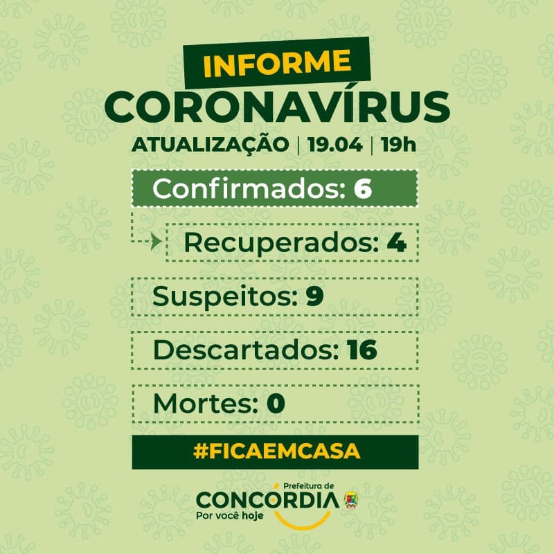 Concórdia – Concórdia registrou o sexto caso confirmado de coronavírus, neste domingo (19). De acordo com a assessoria de imprensa da prefeitura, trata-se de uma mulher de 49 anos, diabética e hipertensa, que teve coleta de material para exame realizado na quinta-feira (16), estava na CTI e agora está em quarto normal, isolada.