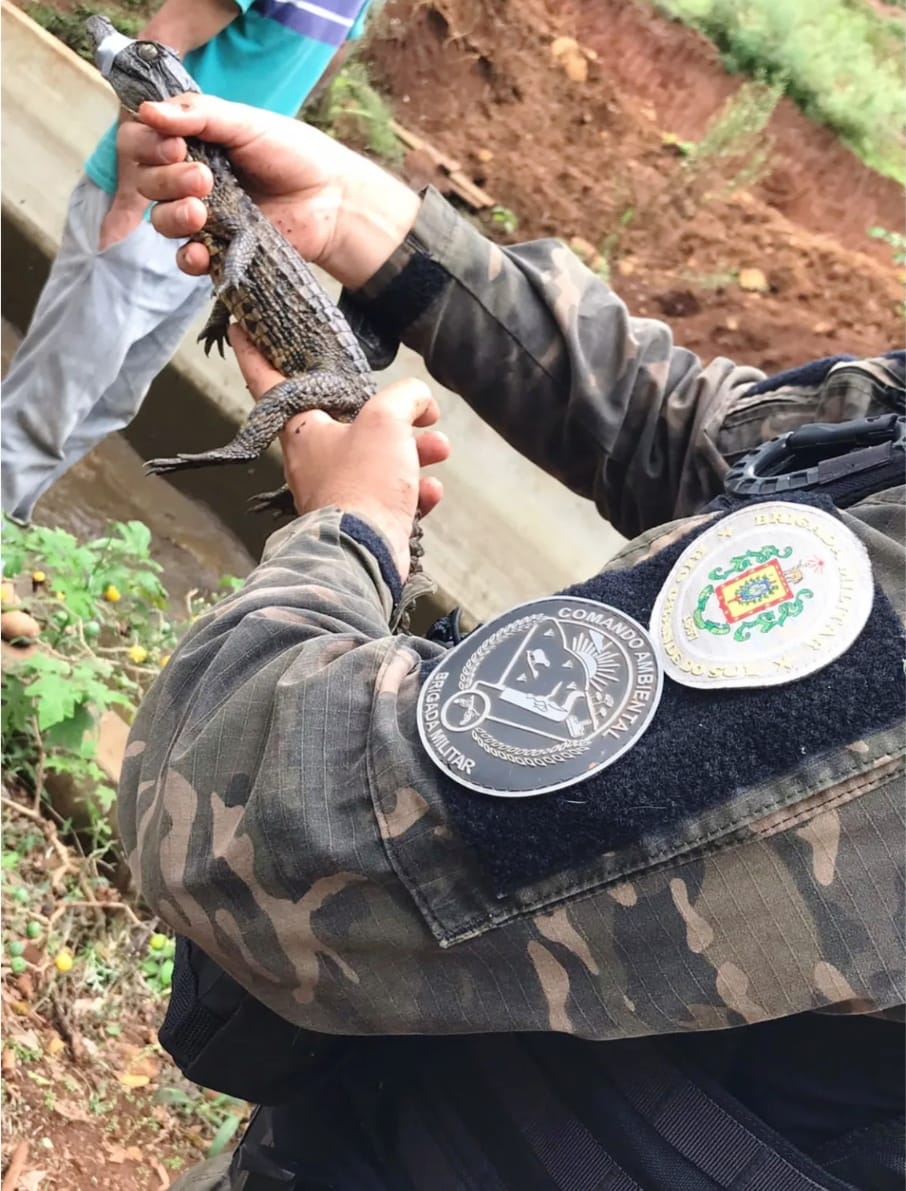 Os policiais fizeram a captura do animal. Eles constataram que era um jacaré-de-papo-amarelo. É possível, conforme a Polícia Ambiental, que o animal tenha sido trazido de outras regiões.
