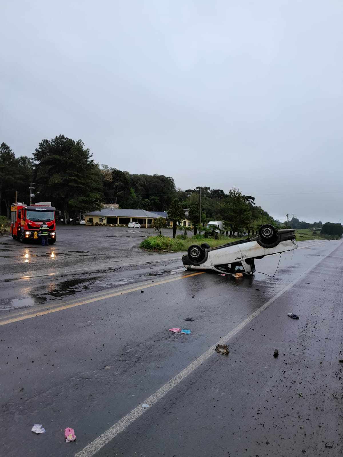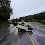 O veículo estava com os rodados para cima sobre a pista. O condutor apresentava-se consciente e orientado, com suspeita de fratura no braço esquerdo e algumas escoriações pelo corpo.