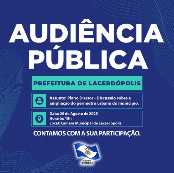 A Prefeitura Municipal de Lacerdópolis, por meio do Poder Executivo, convida toda a população para participar da Audiência Pública do Plano Diretor para discutir a ampliação do perímetro urbano do município.