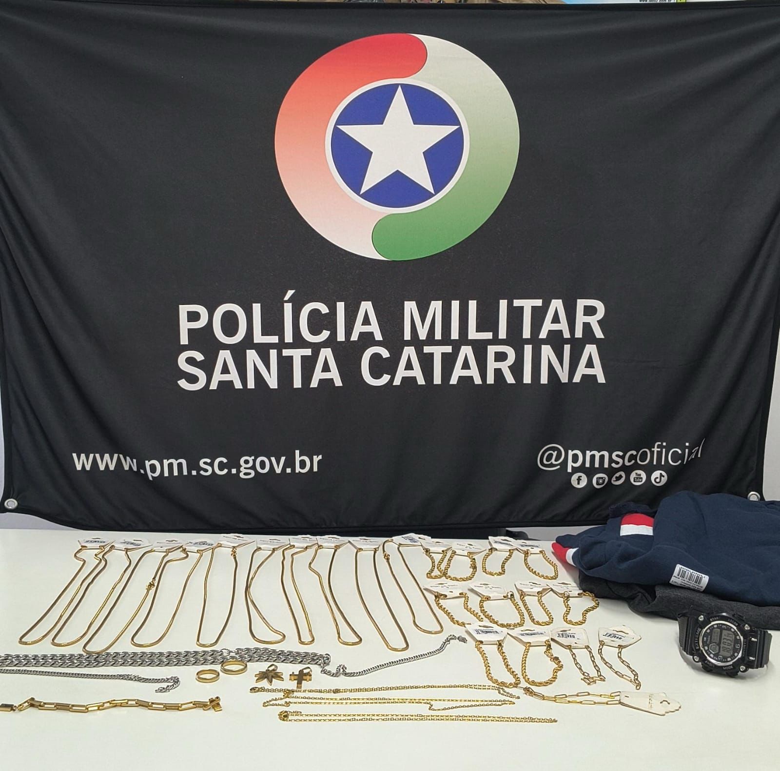 O suspeito foi localizado e abordado na Rua Santos Dumont, em Herval d’Oeste, identificado pelas características descritas pela vítima. Durante a revista pessoal, os policiais encontraram duas bermudas com código de barras, porém sem etiquetas, além de diversas peças de bijuterias, colares e pulseiras, ainda com etiquetas de outra loja da cidade.