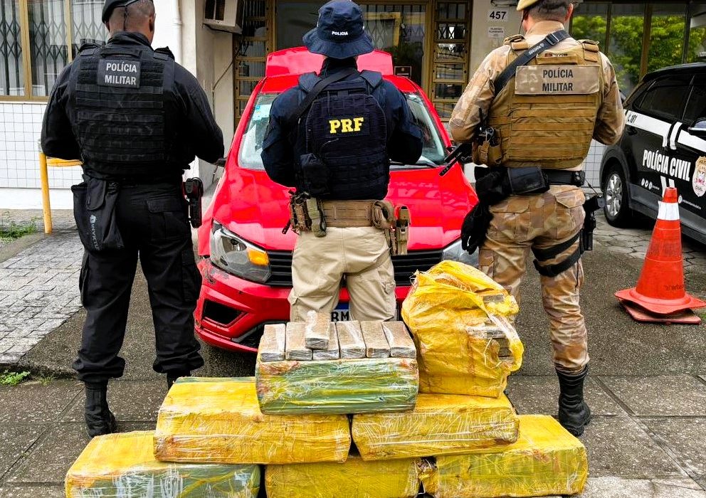 A Polícia Rodoviária Federal e a Polícia Militar de Santa Catarina apreenderam 170 quilos de maconha na BR-101 na manhã desta quinta-feira (25). O carregamento estava em um carro conhecido pelos policiais por ser usado em furtos na região, que trafegava em São José, na Grande Florianópolis.