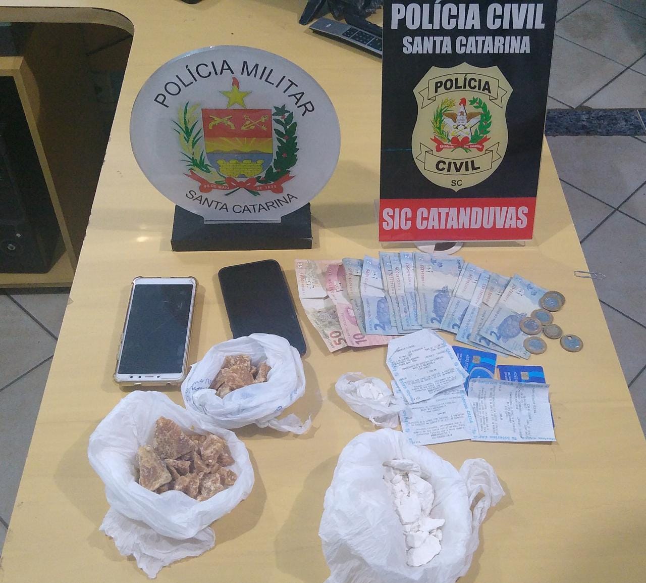Em busca pessoal nada foi localizado e na busca veicular foi localizado na porta do motorista a droga relatada. Os dois receberam voz de prisão e foram apresentados na Delegacia de Polícia de Catanduvas para as providências cabíveis juntamente com o veículo, o material apreendido, drogas, R$ 92, dois celulares, três cartões bancários, além de três comprovantes de depósitos nos valores de R$ 2.700,00, R$ 1.200,00 e de R$ 600,00, todos em nome de uma mesma pessoa.do sexo feminino.