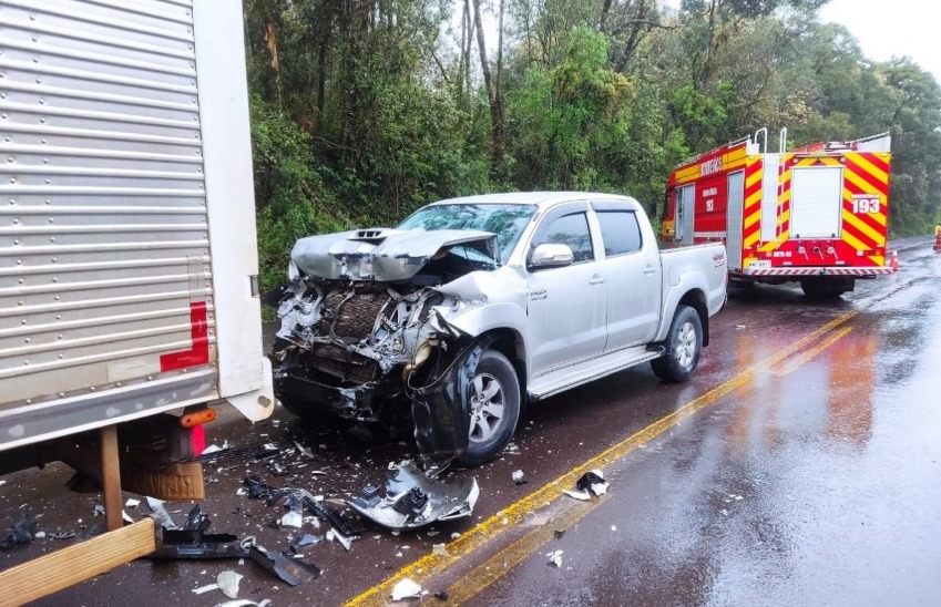 Ao chegar no local, foi confirmada uma colisão traseira entre uma camionete Hilux e caminhão baú. Com a força da batida, o caminhão bateu na traseira de um terceiro caminhão, que após o choque seguiu em deslocamento.