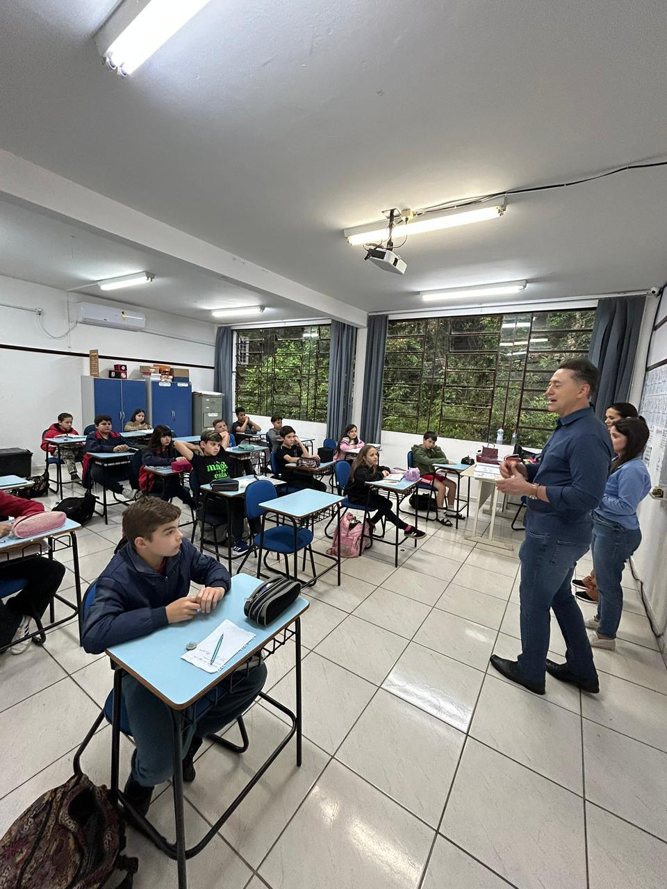 O prefeito Vanderlei Weber e a secretária de Educação, Ana Paula da Silveira, estiveram na Escola Amélia Poletto Hepp na última quinta-feira, passando pelas salas dos 5° e 9° anos, acompanhados da diretora Tânia de Souza.