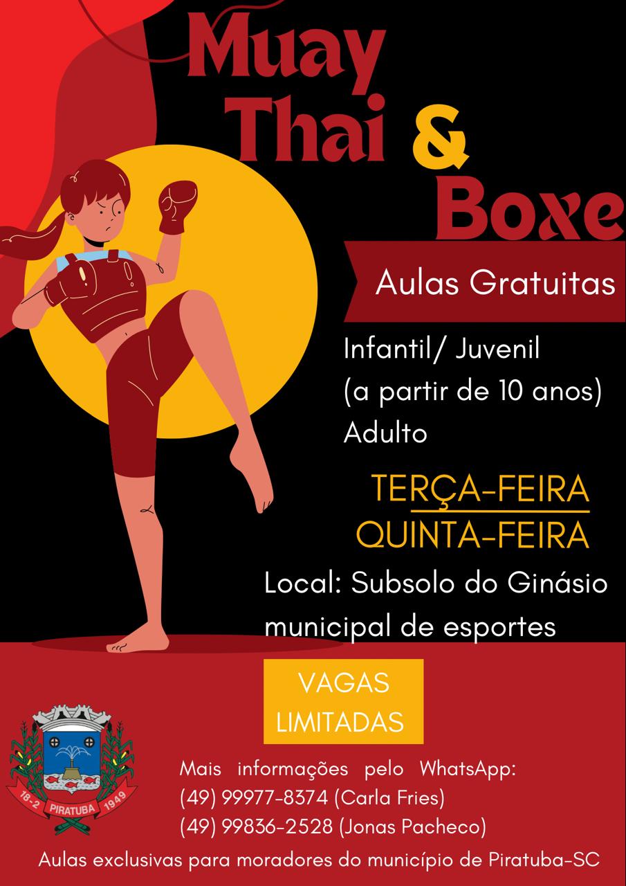 A Prefeitura Municipal de Piratuba inicia nesta terça-feira, dia 15 de abril, as aulas do projeto gratuito de Muay Thai e Boxe, voltado para crianças, adolescentes e adultos, residentes no município. As atividades serão realizadas no subsolo do Ginásio Municipal de Piratuba, com turmas organizadas por faixa etária e horário.