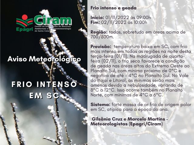 Temperatura: baixa, com geada nas áreas altas do Extremo ao Planalto Sul. Veja o aviso meteorológico abaixo: