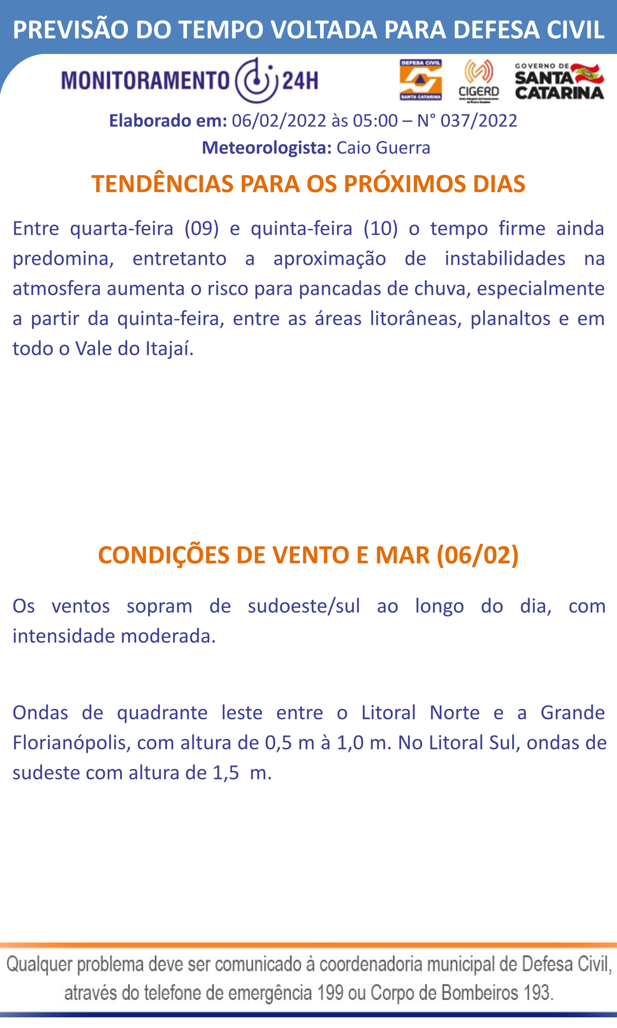 Tempo: no Litoral Norte, especialmente na região de Joinville e áreas próximas, chuva fraca e isolada no início e fim do dia. Nas demais regiões, sol com algumas nuvens. Tempo mais seco do Extremo Oeste ao Meio-Oeste.